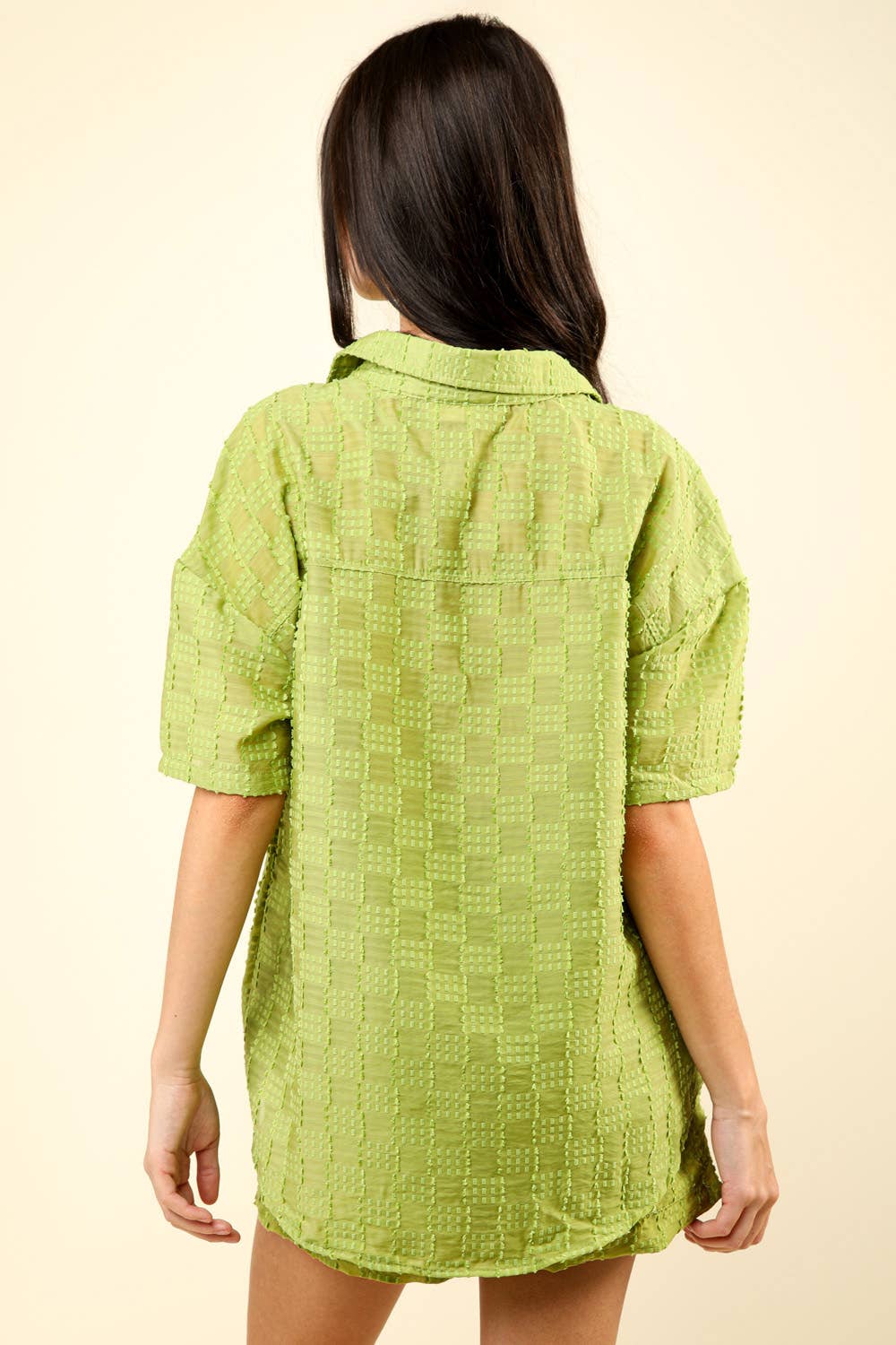 Textured Woven Comfy Shirt Top & Shorts Set TOP - Oversized - Drop Shoulder - Patch Pockets - Short Sleeve - Round Hem - Bright Colors - Button Up - Oversized Shirt - Oversized Woven Shirts - Woven Shirts - Laid Back Casual Shirts - Transitional Shirts - Sets BOTTOM - Elastic High Waist - Waist Ruffle Detail - Side Pockets - Side Slit (Model height: 5'7", wearing a Small)